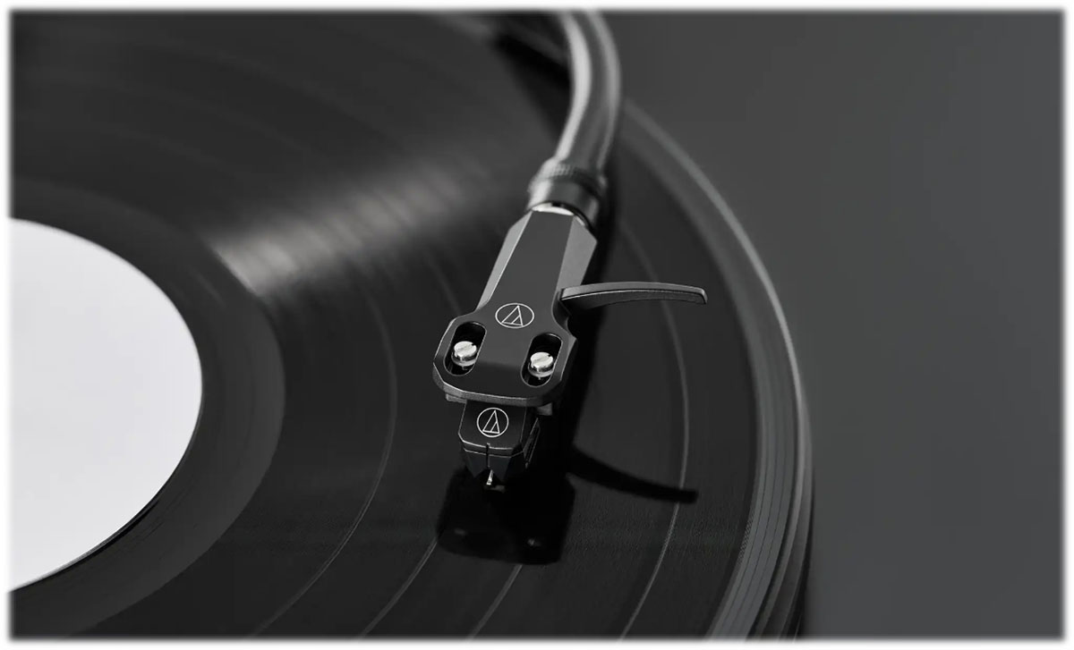 Ramienko gramofónovej prenosky Audio-Technica na čiernej vinylovej platni v detailnom zábere, moderná hi-fi phono prenoska