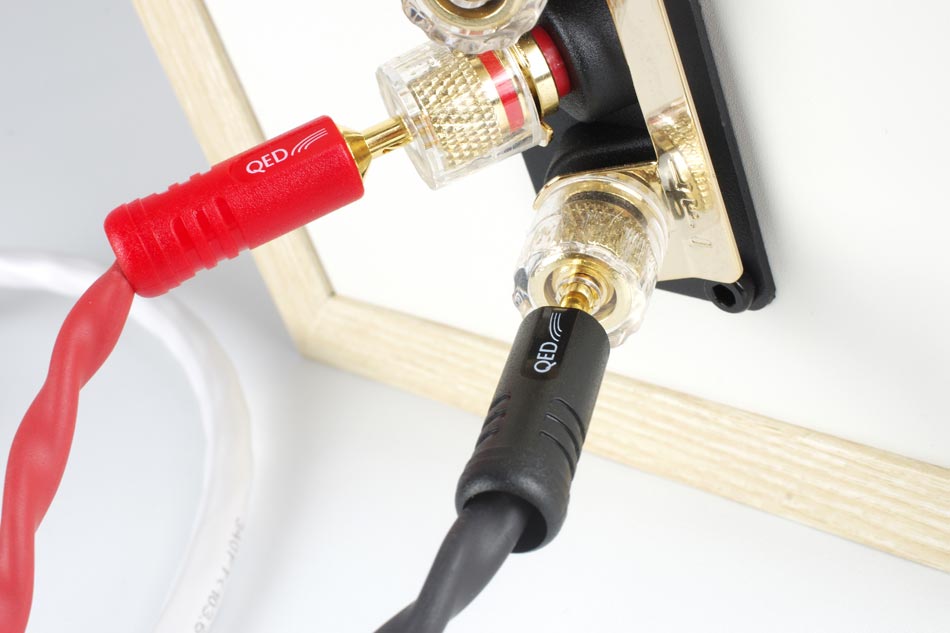 - Pozlátené berilium – medené reproduktorové konektory QED AirLoc / Audioquest Crimp BFA Gold (banány) / alebo Crimp Spade (vidličky)