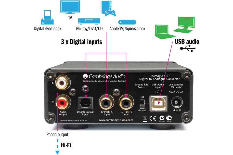 – DacMagic 100 je veľmi flexibilný a podporuje prakticky všetky digitálne formáty súborov, vrátane najvyššej kvality 24-bit studio master, alebo bezstratové zvukové súbory uložené na vašom počítači
