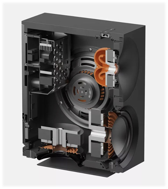 Každá reprosústava obsahuje 28 mm custom tweetrový menič s dvojitým polomerom hliníkovej kupoly, špeciálnym vlnovodom a zadnou komorou pre holografickú zvukovú scénu a detailné výšky. Basovú sekciu tvoria dva 4″ meniče (jeden predný a jeden smerujúci nadol) spolu s dvoma 4,75″ force-cancelling pasívnymi radiátormi na bočných stranách. Táto konštrukcia zabezpečuje hlboký, artikulovaný a kontrolovaný bas bez potreby samostatného subwoofera, pričom minimalizuje vibrácie.