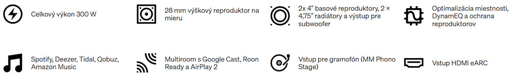 - Konektivita: HDMI eARC, Bluetooth (SBC, AAC), Wi-Fi 5, Ethernet, RCA Aux, RCA Phono MM, USB-C Audio, USB-A Media, Optical TOSLINK, subwoofer out