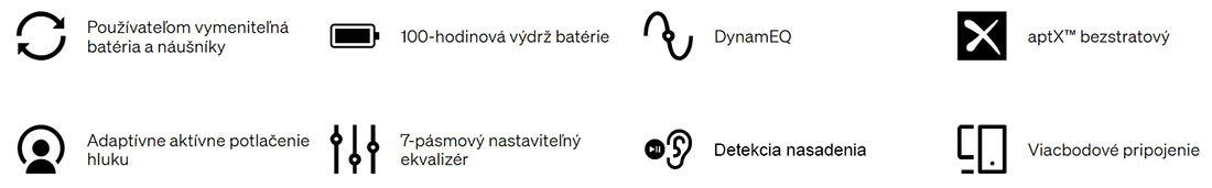 - Ohromná výdrž batérie na jedno nabitie až 100 hodín (alebo 60 hodín so zapnutou funkciou ANC)
