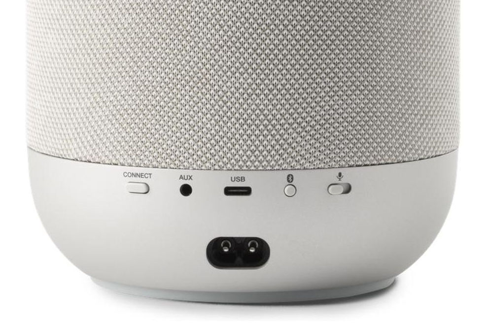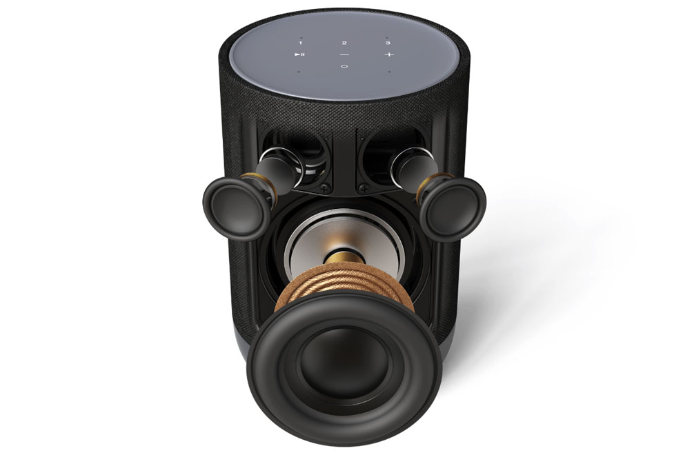 Dizajn je moderný, elegantný a priestorovo úsporný – valcové telo s prémiovým povrchom sa hodí do každej miestnosti (dostupný v čiernej Charcoal alebo Charcoal Stone). Reproduktor je pripravený na hlasové ovládanie (kompatibilný so Siri), má mikrofón s možnosťou vypnutia a tlačidlá Quick Select pre rýchly prístup k obľúbeným zdrojom.
