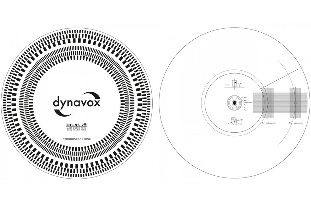 - Dynavox Strobo – šablóna pre nastavenie prenosky a stroboskopický disk pre presné nastavenie rýchlosti otáčok gramofónu v jednom