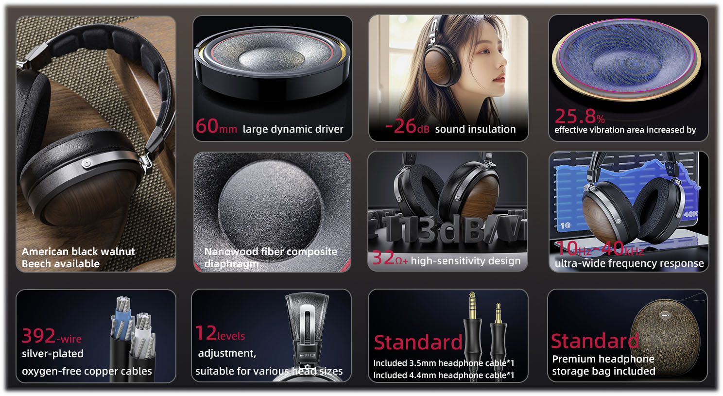 - Mušle slúchadiel sú vyrobené zo špeciálne vybraného dreva amerického čierneho orecha triedy FAS, vďaka čomu redukujú nežiaduce rezonancie