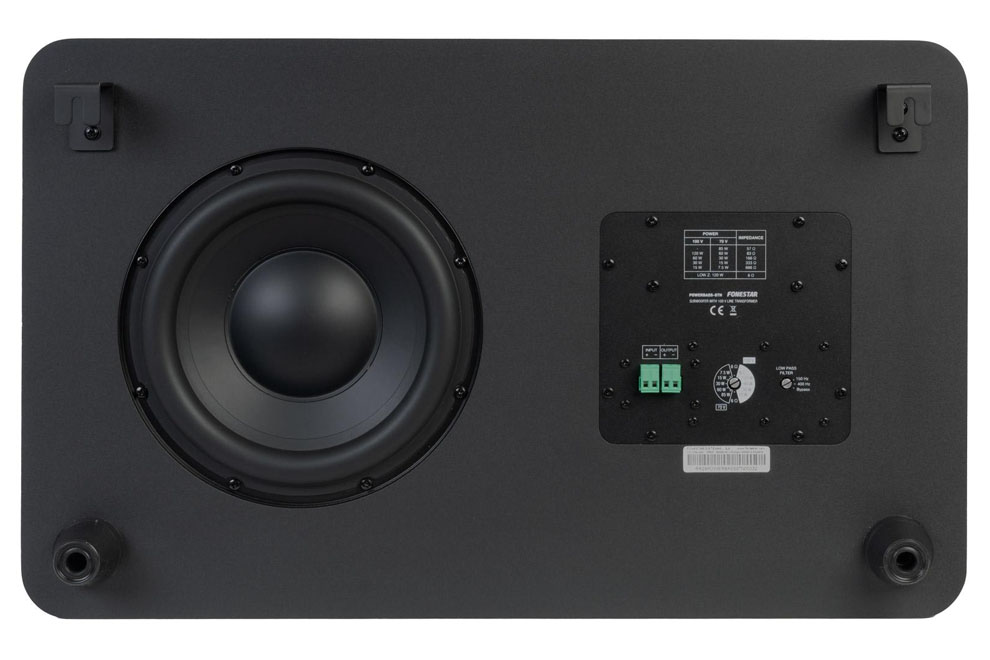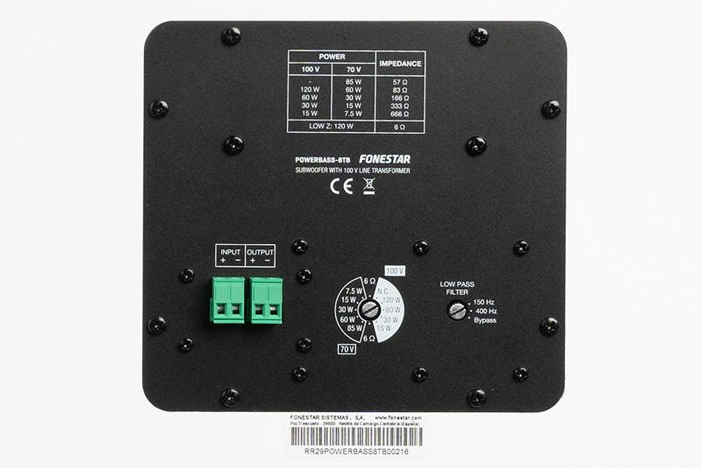 Fonestar Powerbass 8T – 8″ kompaktný plochý pasívny subwoofer • Subwoofer je určený nízkoimpedančné pripojenie 6 ohmov – ale aj pre 70/100V rozvody • Vybavený prepínateľným Low pass filtrom: 150Hz, 400Hz alebo plným rozsahom • Umožňuje nastavenie príkonu 120/60/30/15W pre 100V • Vhodný aj na inštaláciu na stenu • Dvojitý bassreflex • Ideálne pre aplikácie ambientnej hudby pre ozvučenie maloobchodov, barov, kaviarní atď. • Farebné prevedenie: Black / White • Cena za KUS