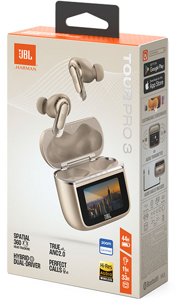 - Slúchadlá JBL Tour Pro 3 sa dodávajú v novo prepracovanom puzdre Smart Charging Case™ s praktickým dotykovým displejom nabitým funkciami, ktorý vám poskytne plnú kontrolu nad zážitkom z počúvania – zatiaľ čo telefón zostane vo vrecku