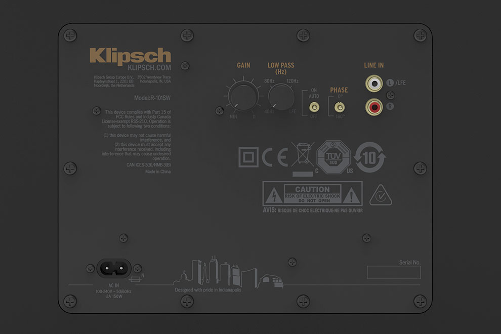 Precízne nastavenia prechodovej frekvencie a fázy zabezpečia, aby sa nízkofrekvenčné tóny subwoofera dokonale „zmiešali“ s ostatnými reproduktormi Klipsch a vytvorili tak ideálnu úroveň basového pásma