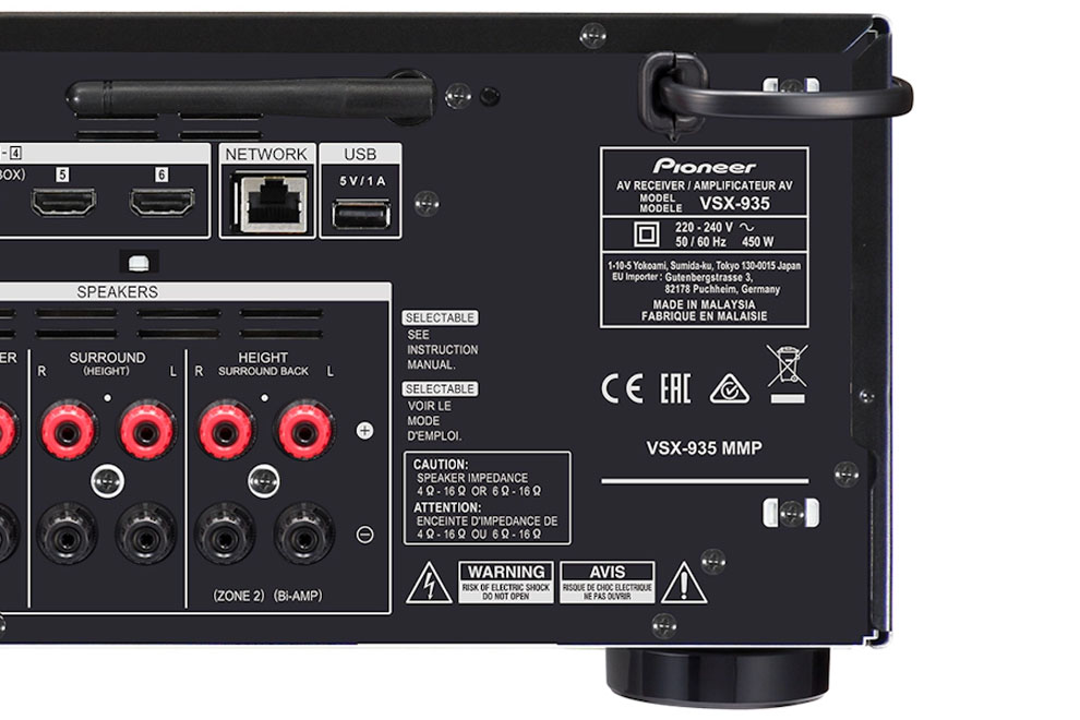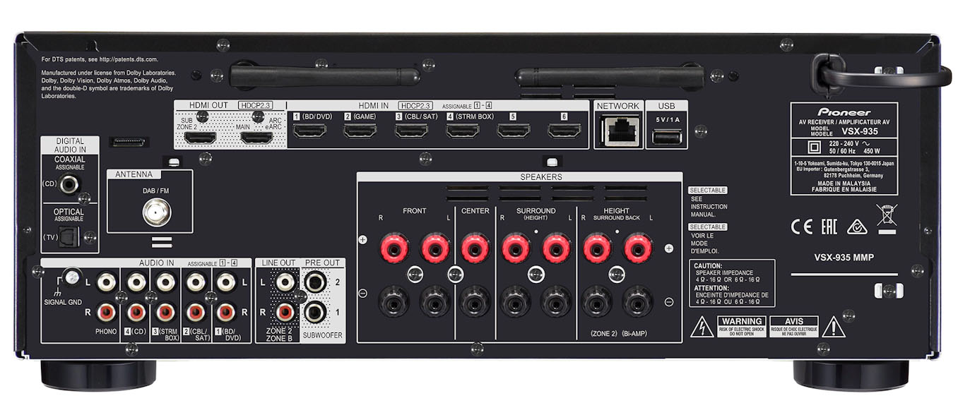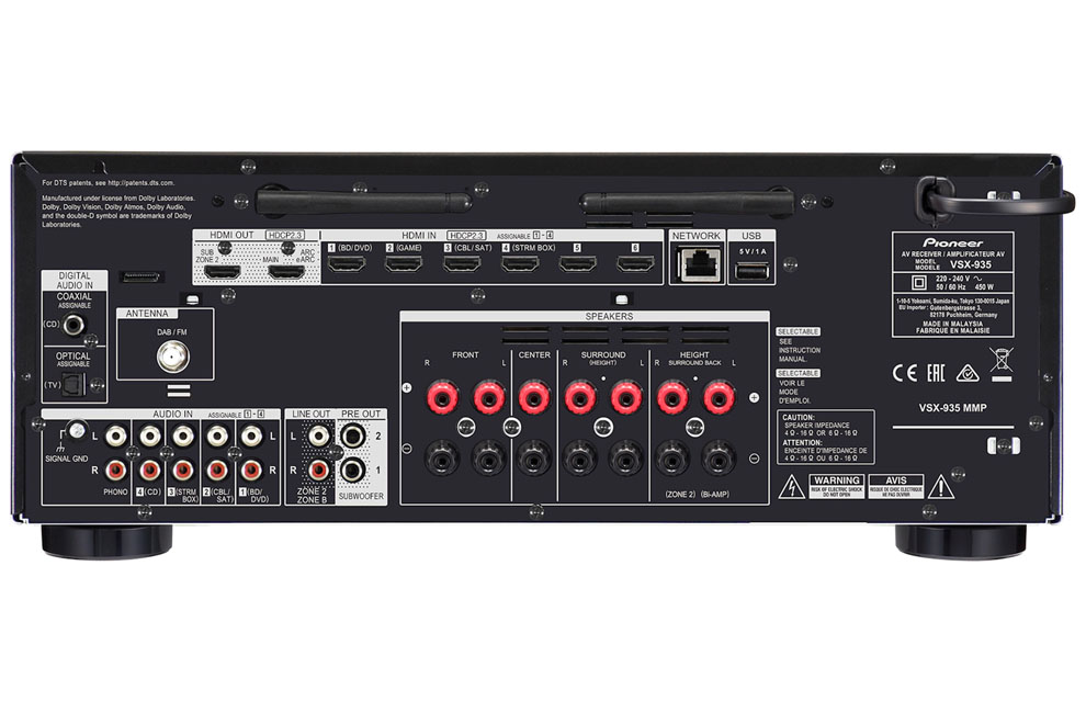 Pioneer VSX-935 – 7.2-kanálový AV receiver s modernými audio/video technológiami • Podpora Dolby Atmos, Dolby Surround Upmixer, DTS:X, Neural:X Upmixer, Dolby Atmos Virtualizer, virtuálny DTS:X • DTS-HD Master Audio, zvuk s vysokým rozlíšením DTS-HD, DTS 96/24, DTS-ES, DTS-HD Express • Vybavený výkonným digitálnym 4-jadrovým 32-bitovým DSP • 384 kHz/32-bitová konverzia D/A s AK4438 (AKM) • Audio Return Channel (ARC) na HDMI, automatická kalibrácia zvuku MCACC, riadenie fáz, EQ subwoofer • Certifikácia Apple AirPlay, spolupráca so Sonos, kompatibilita s Amazon Music, Spotify, TIDAL a Deezer • Bluetooth • AM/FM/DAB+ tuner • Farebné prevedenie: Black / Silver