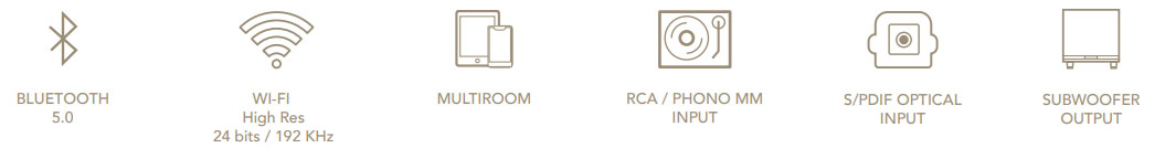 - Wi-Fi : Vychutnajte si vynikajúcu kvalitu zvuku vďaka technológii Wi-Fi, ktorá umožňuje streamovať skladby vo vysokom rozlíšení (24 bitov / 192 kHz) a zabezpečuje optimálnu kvalitu