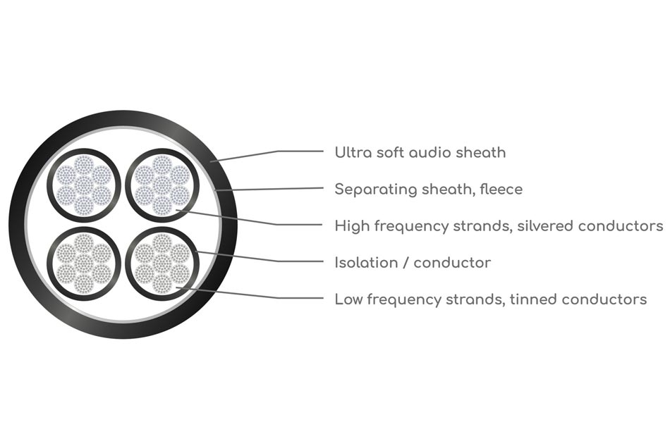 - Vodiče: 4 twistované vodiče uložené symetricky, každý 4mm2 – 2 postriebrené pre výškovú sekciu reprosústav + 2 pocínované pre basovú sekciu reprosústav