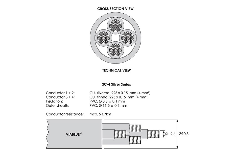 - ViaBlue SC-4 Silver Speaker Cable = 4 x 4.0 mm² – 896 jednotlivých prameňov kombinovaných pomocou 4 x 7 splietaných zväzkov do 4 samostatných prameňov