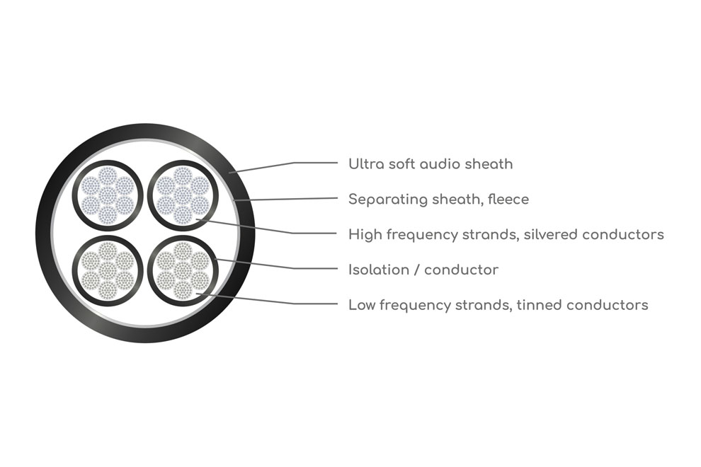 - Dva vodiče s postriebrenými medenými vláknami OFC poskytujú hlboké a krištáľovo čisté vysokofrekvenčné podanie